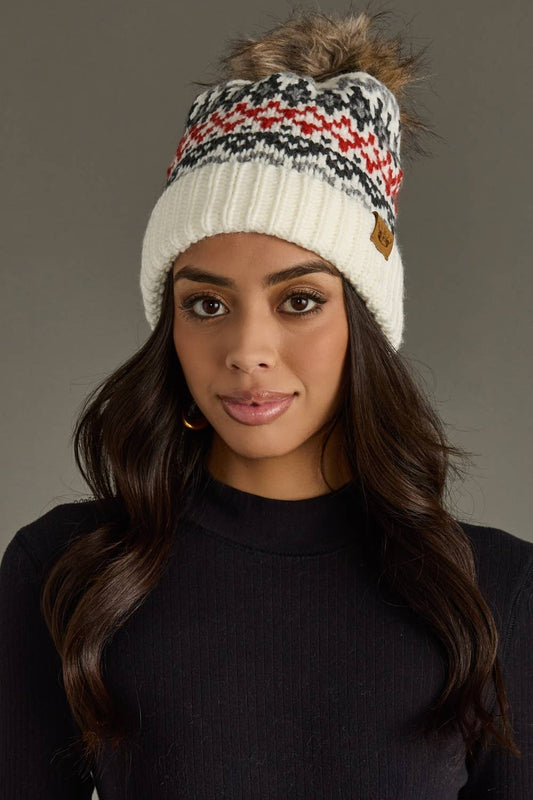 Ivory, Red & Gray Winter Pattern Pom Hat