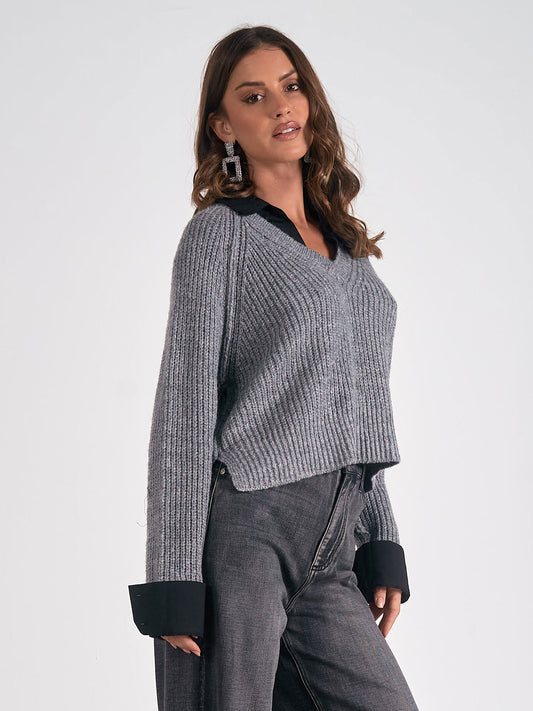 V-NECK ATTACHED COLLAR SWEATER