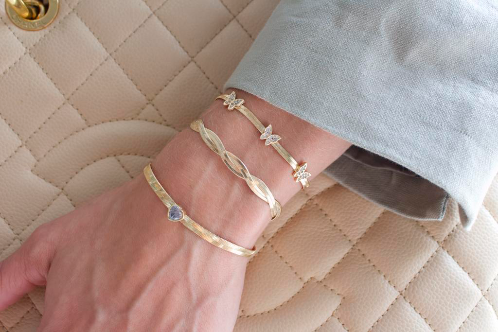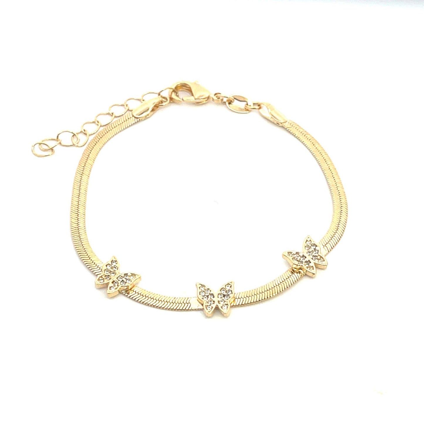 Indulge in luxury and elegance with the 3mm Herringbone CZ Butterfly Charm Bracelet. Crafted with delicate 3mm herringbone chain and adorned with a sparkling CZ butterfly charms, this bracelet is the perfect accessory to elevate any outfit. Embrace sophistication and style with this exclusive piece.