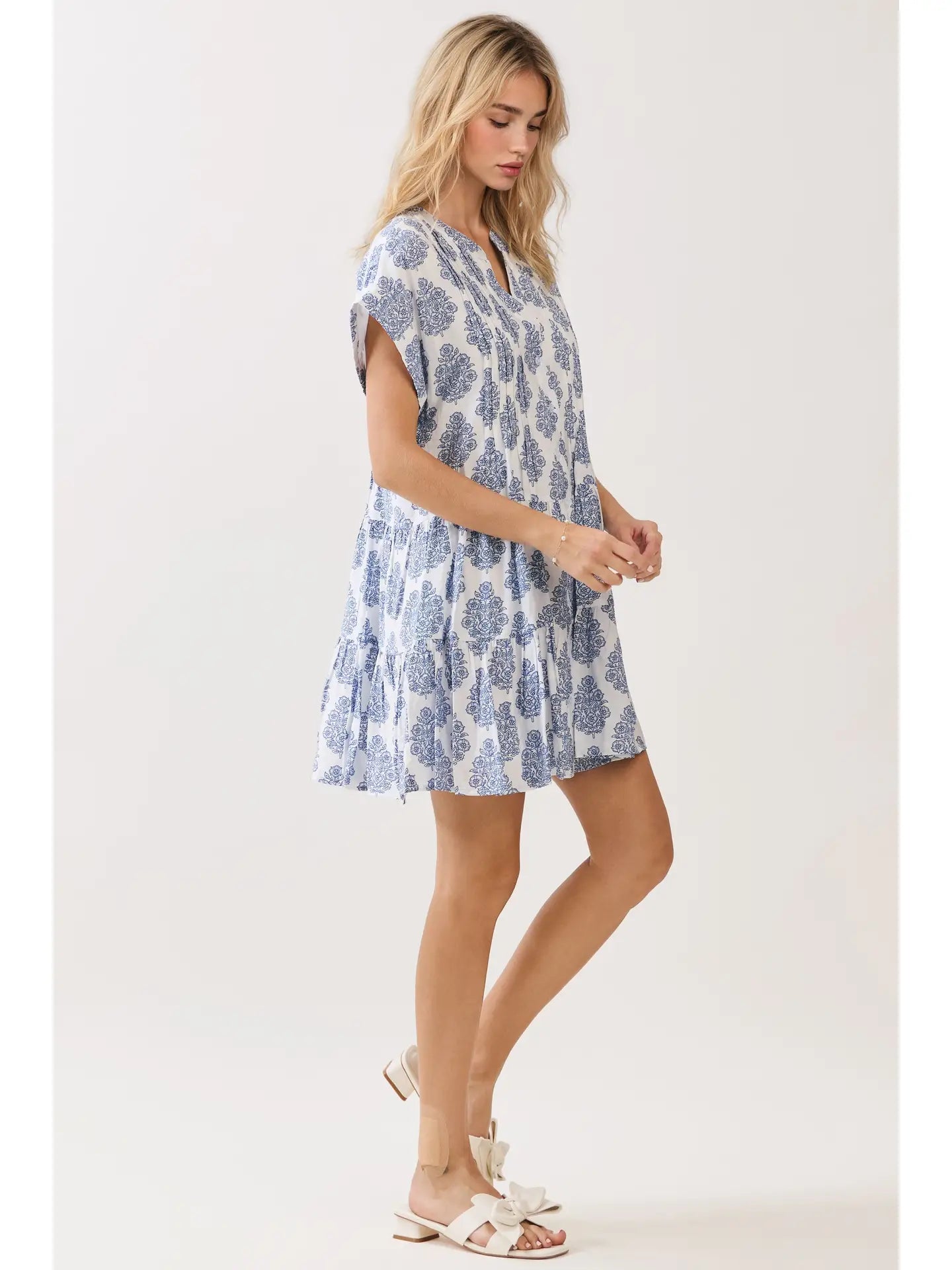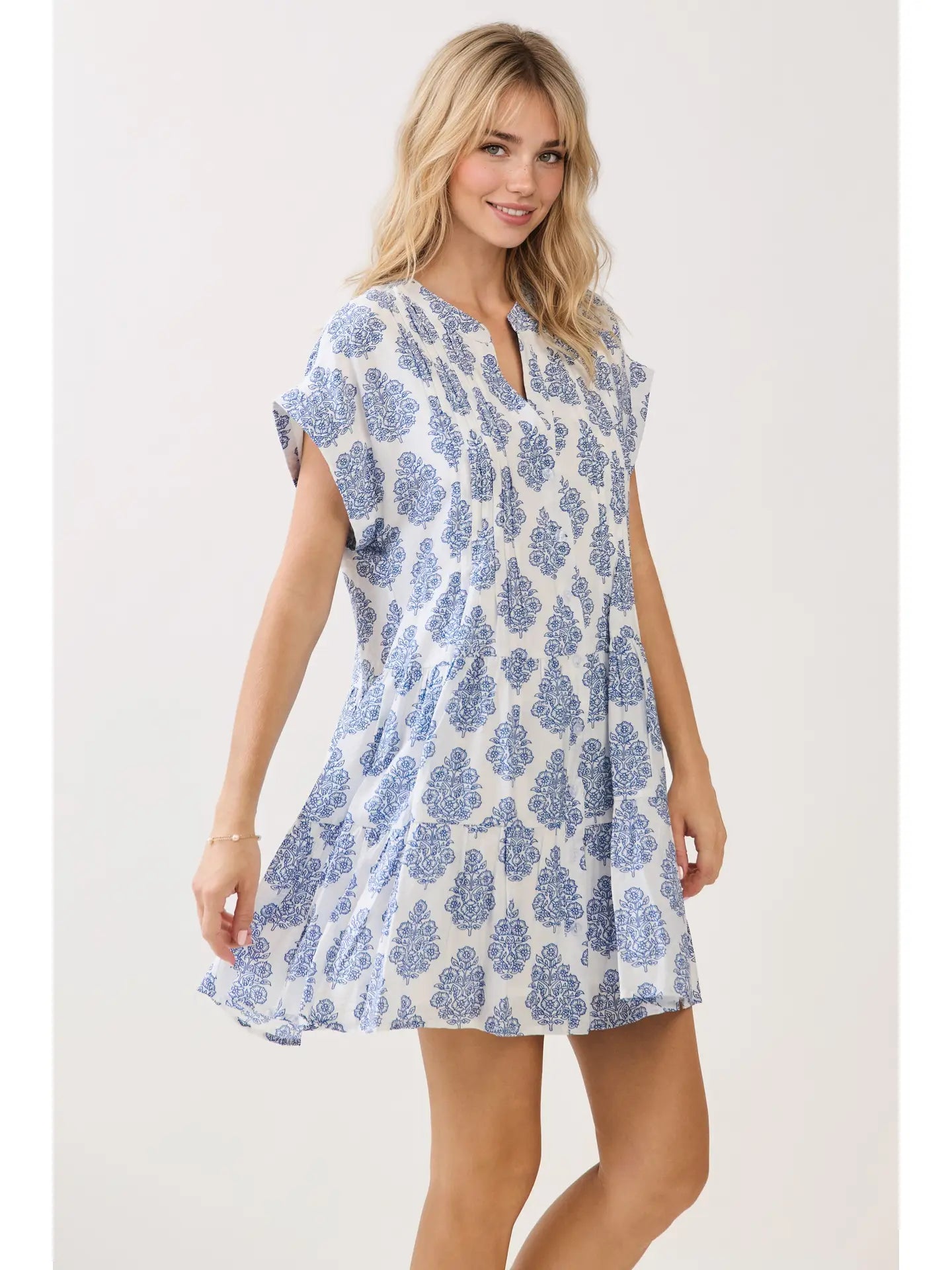 A printed mini dress featuring a notch neckline, short flutter sleeves, and subtle pleated detailing along the bodice. Finished with a gathered waist seam and a softly tiered skirt for a flattering, flowy fit.