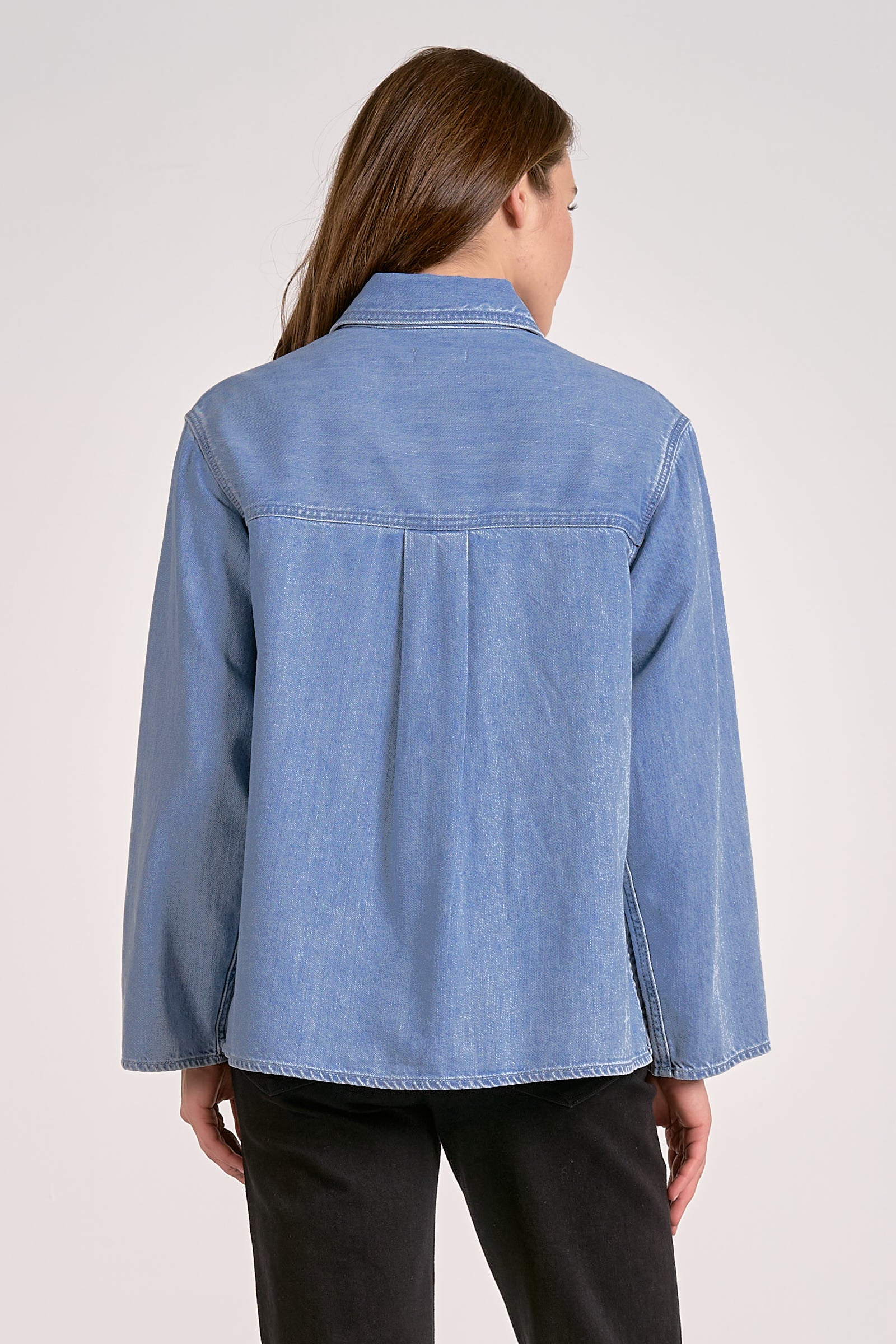 Make a bold statement with this Denim Wash top from Elan, featuring a sharp collared neckline and striking button-up design.