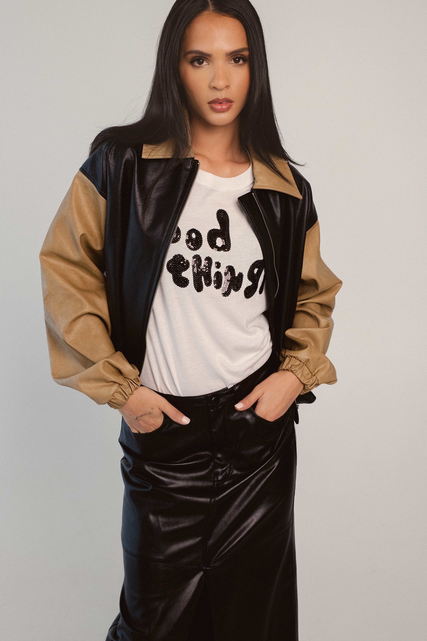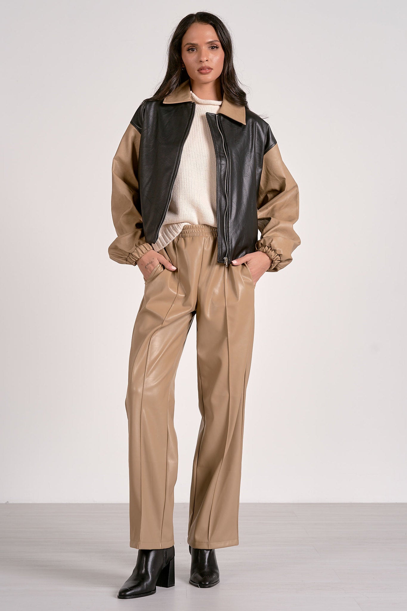 Rock a bold two-tone look with this color block faux leather bomber jacket! The striking contrast between sleek black and warm macchiato creates instant visual interest, while the soft faux leather keeps things cruelty-free and easy to care for. Perfect for layering over your favorite tee or dress, this playful piece brings edge and sophistication to any outfit. Throw it on and turn heads.