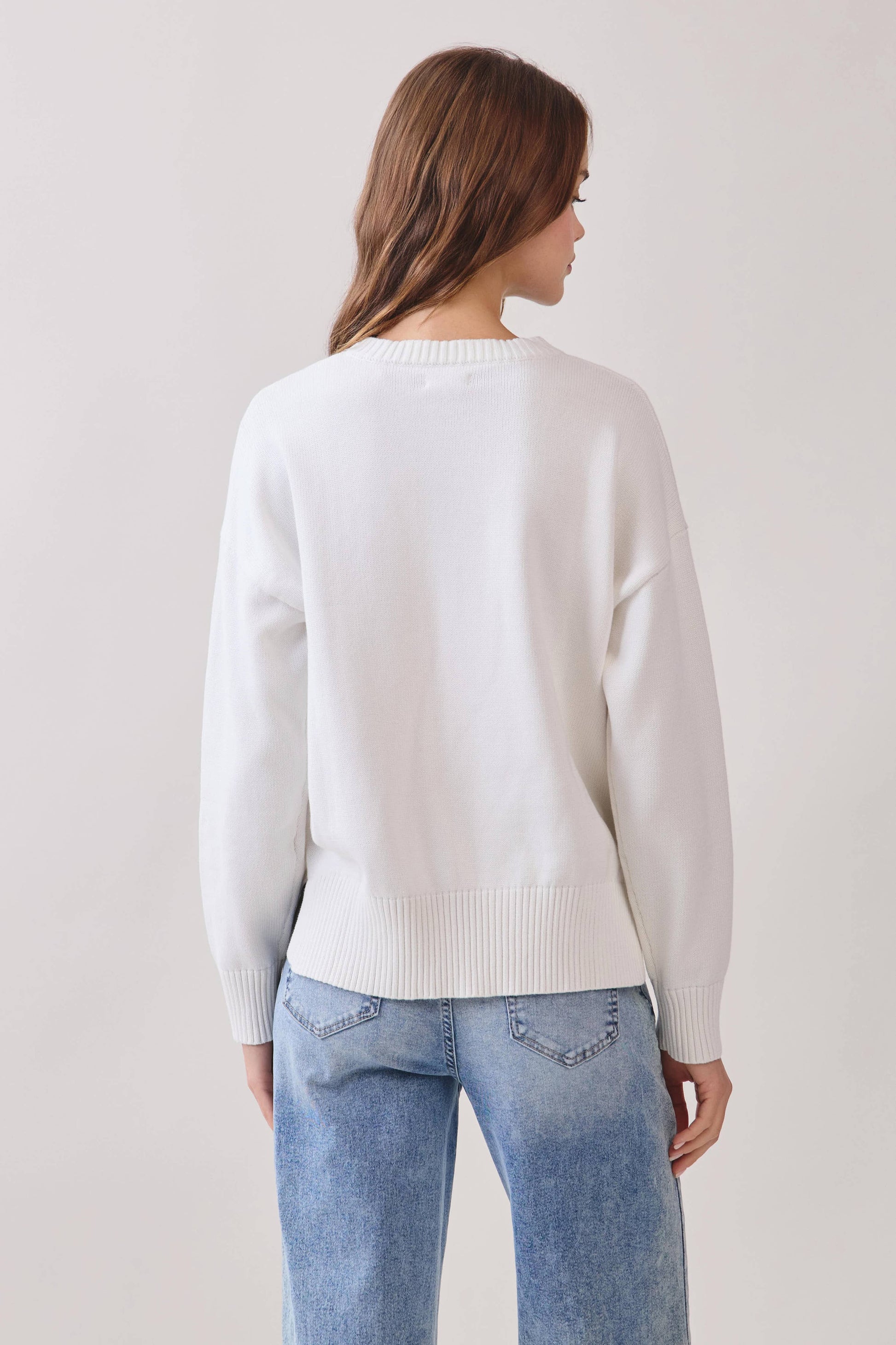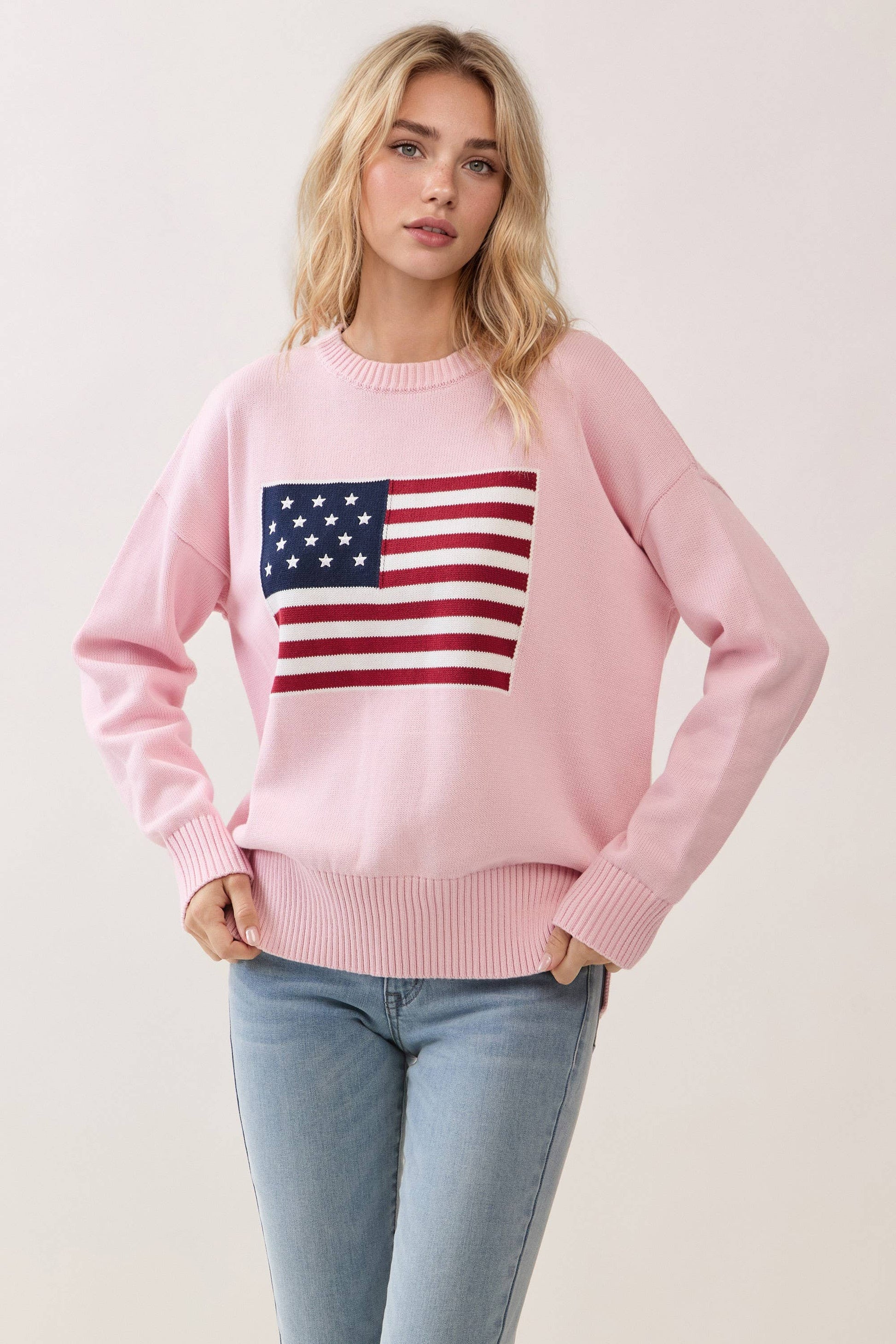 A soft knit pullover sweater featuring a classic American flag motif at the front. Designed with a relaxed silhouette, crew neckline, and long sleeves for effortless comfort. Finished with ribbed trim at the neckline, cuffs, and hem for a clean, polished look.