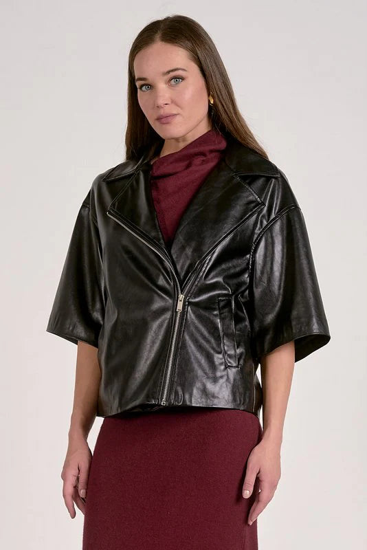 The Fiona Jacket is a cropped, short-sleeve outer layer crafted in coated fabric for a modern, structured feel. Designed with an oversized fit, it’s ideal for fall layering — style over a turtleneck or under heavier coats for a directional, fashion-forward finish.