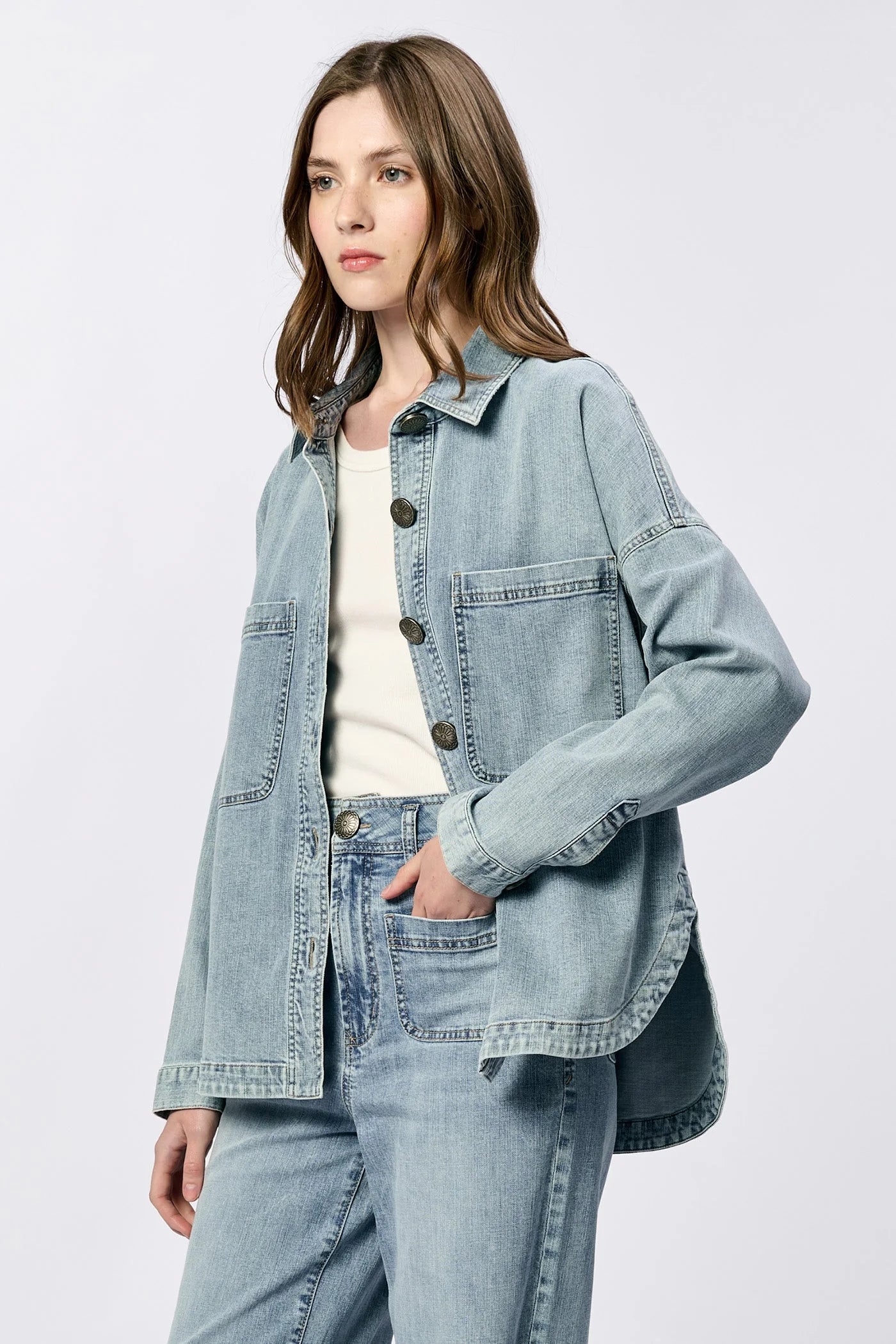 Gina denim shirt jacket is the stable piece combines long sleeves with practical pocket details and a clean hemline for a chic yet functional look. Crafted from blended cotton and spandex, this jacket offers relaxed fitting that is both stretch and comfort, ideal for versatile outfits. Perfect to go with all ensemble pairings.