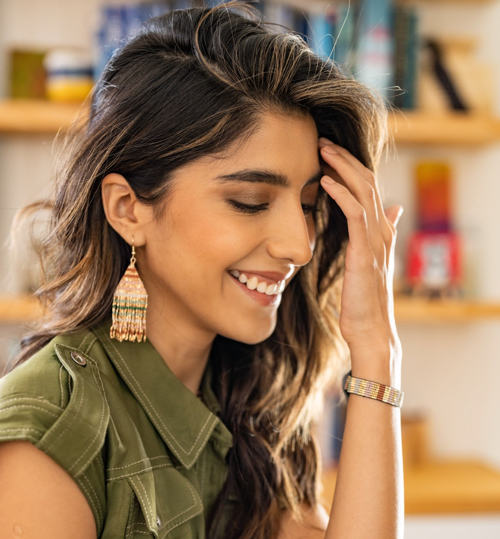 Lovers of petite fringe earrings, these are just what you need! Lightweight, yet impactful, these Luxe glass beads offer shimmer + shine like no other. Reach for these desert-striped beauties as a jewelry box neutral. Shades of light pink, rust + green go with everything! Trust us.