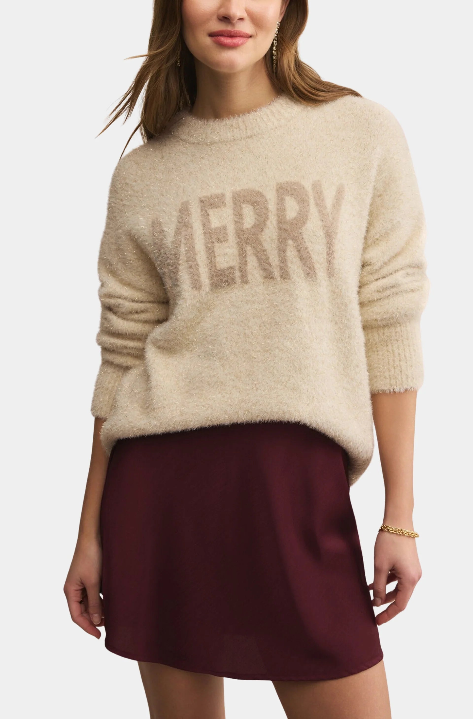 Snuggle up in the Z Supply Merry Gold Sweater, the ultimate cozy companion. With its relaxed fit, long sleeves, and trendy crew neck, it's perfect for chilly days. The playful 'MERRY' graphic adds a cheerful touch, making it a must-have for holiday festivities and beyond.