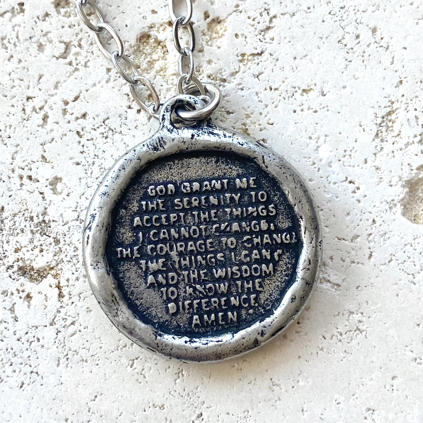 This necklace is 2 layers (one piece) and reversible! The first layer is a hand casted mini vintage cross with a sparkly Swarovski crystal. The second layer is a hand casted vintage cross and if you turn it over you will see the serenity prayer. This makes a very special gift. Stainless steel non tarnishing chain. Adjustable up to 20”