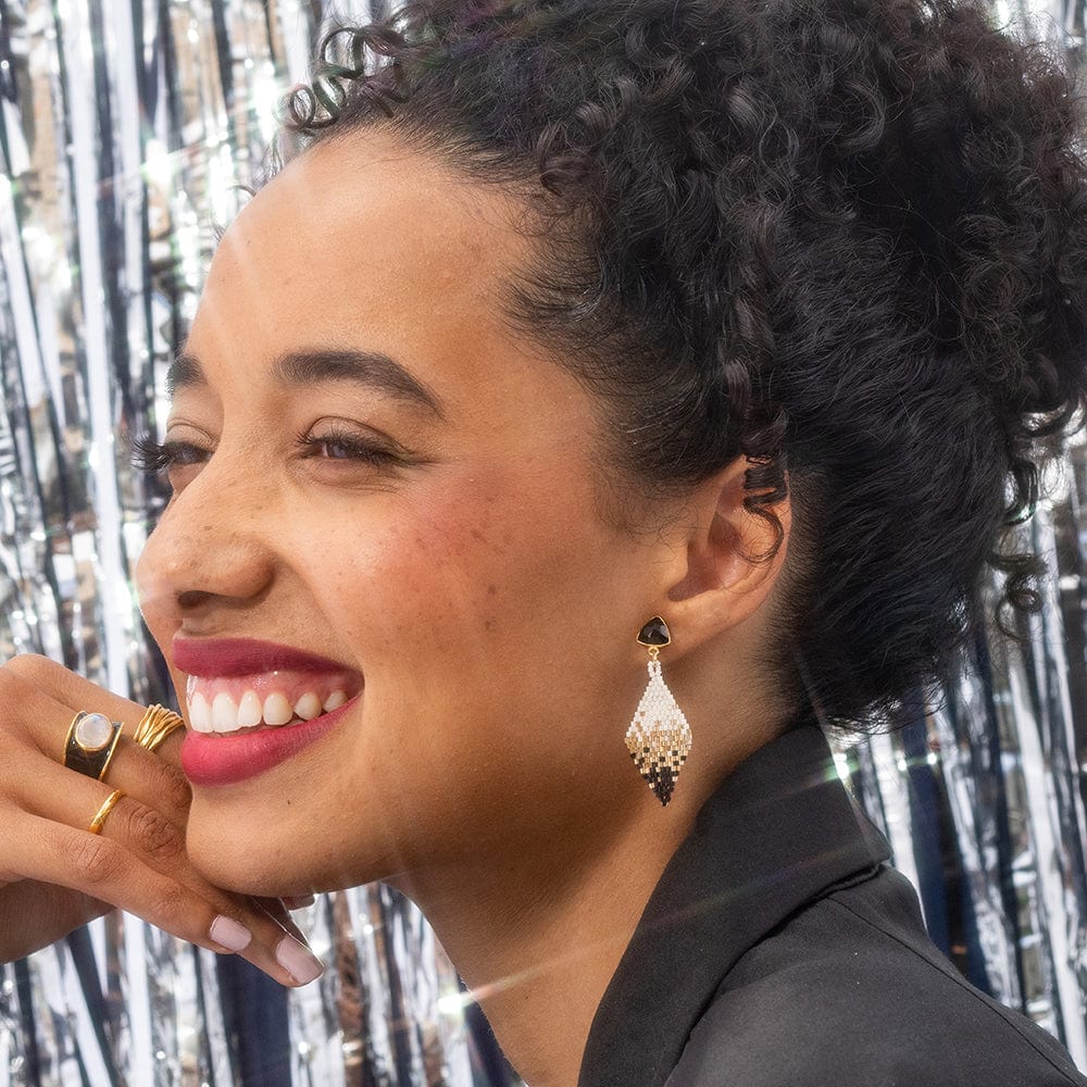Introducing Sky, the earrings that are about to take your accessory game to new heights! These small diamond drop earrings with semi-precious stone posts are here to add a touch of elegance and intrigue to your look. Picture this: you're getting ready for a sophisticated soirée, and you need a pair of earrings that are as mysterious as the night sky. Enter Sky, with her captivating combination of shimmering gold and silver. The diamond-shaped beaded design creates a mesmerizing pattern that's sure to draw admiring glances from across the room.