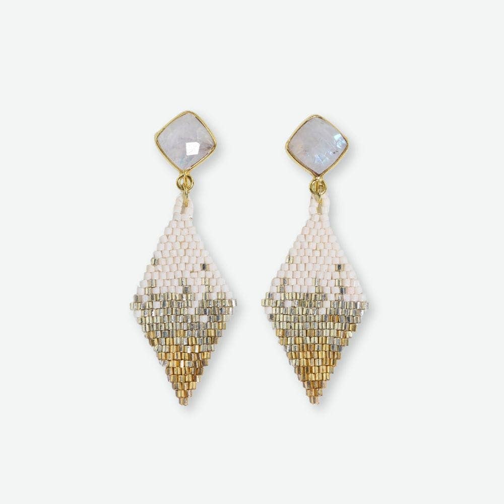 Introducing Sky, the earrings that are about to take your accessory game to new heights! These small diamond drop earrings with semi-precious stone posts are here to add a touch of elegance and intrigue to your look. Picture this: you're getting ready for a sophisticated soirée, and you need a pair of earrings that are as mysterious as the night sky. Enter Sky, with her captivating combination of shimmering gold and silver. The diamond-shaped beaded design creates a mesmerizing pattern that's sure to draw admiring glances from across the room.